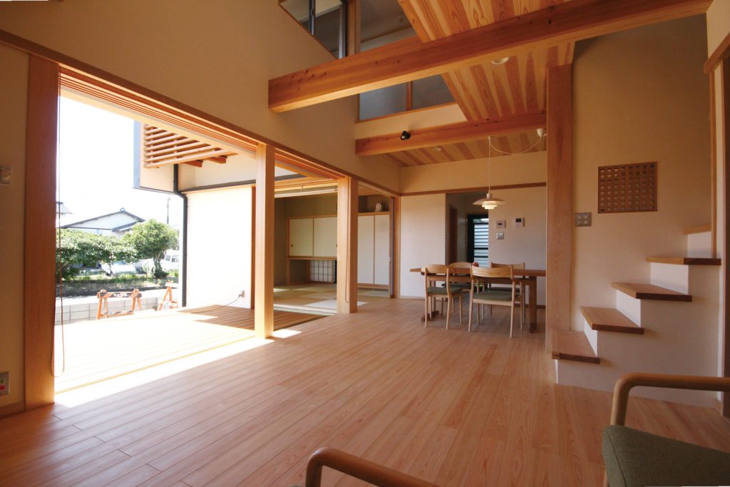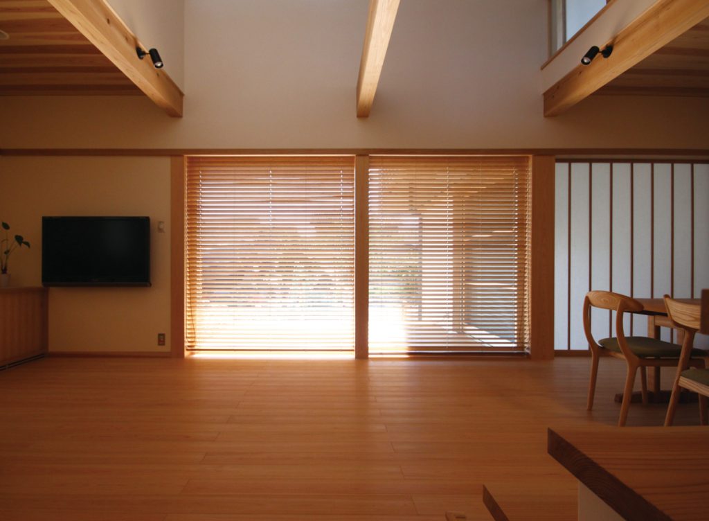 垂れ壁の中にウッドブラインドのカーテンボックスをつくって収納できる仕組みを考えた。庭に向かった大きな窓を邪魔する事なく景色が楽しめるスッキリとした窓際をつくる事が出来る。