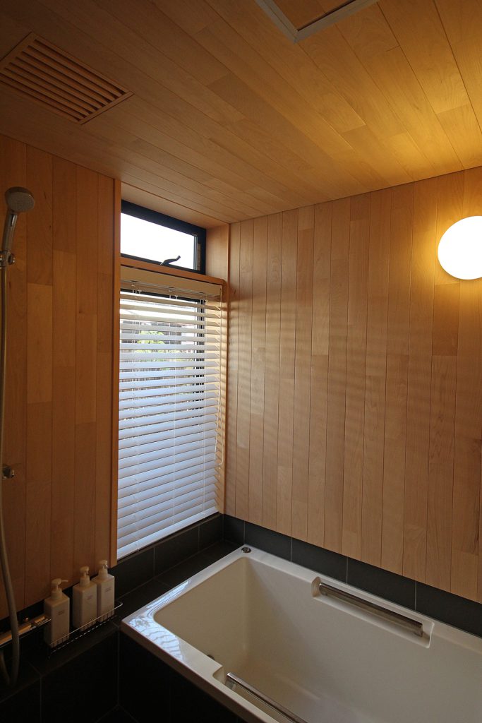 浴室の窓に取り付けた耐水タイプのウッドブランド。浴室の窓を透明ガラスにするケースは少ないが、坪庭などをつくって日中浴室から外を眺めるのもなかなか良い。FIXとすべり出し窓を連窓した縦長の窓がお気に入りで、FIX部分にウッドブラインドを取り付けている。