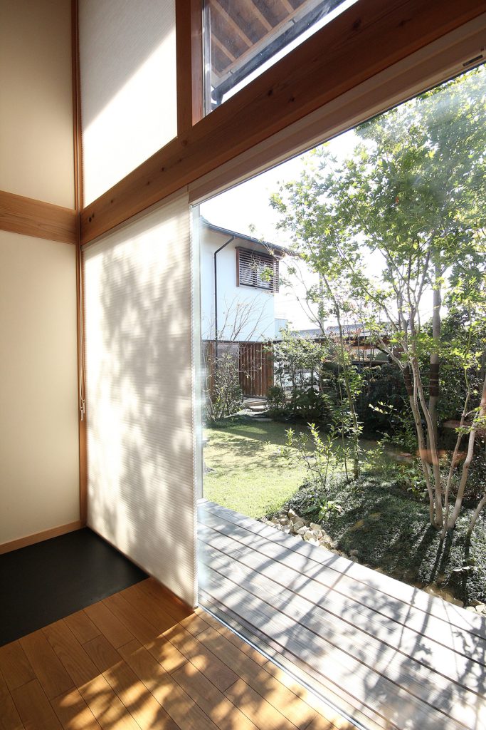 玄関の大きなガラス窓に取り付けたウッドブラインド。窓の外にはジューンベリーを植えて目隠しとしているが、落葉の後はブラインドが活躍している。木に包まれた空間の中にある窓はより景色が強調され、ブラインドを透過する緑がとても心地よい。