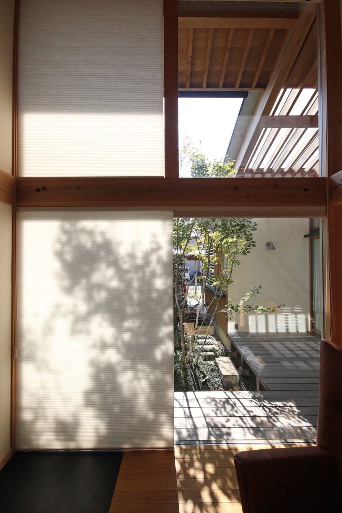 中庭の板塀とロールスクリーンを使って視線を隠している。隣家の2階からの目隠しに効果的。幅2.7mの一枚のタイプもあり継ぎ目のないシンプルな表情をつくることが出来る。