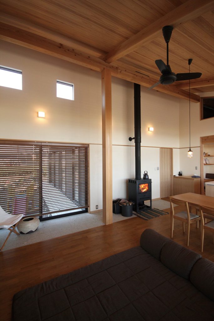 掃き出し窓からの日射とプライバシーを考えてウッドブラインドを設置。シックなダークブラウン色を使って、重厚かつリゾート感を演出。日差しや隣地からの視線を上手にコントロールしている。